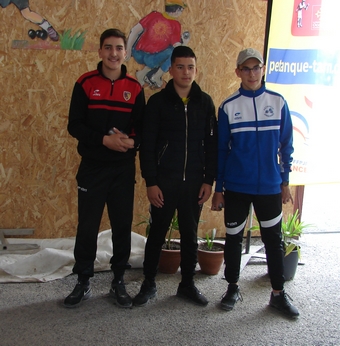 CHAMPIONNAT TRIPLETTE JUNIORS 2019 VainqueursThéo HERGERT de la Pétanque la Gare Brassac, Nathan LUGAN de la pétanque Club la Bouriatte, et Donovan RIOU des Joyeux Pétanqueurs Graulhétois FinalistesRomain BERRO de la Pétanque Jonquières, Brice HOSPITALIER de la pétanque Trébassole et Daniel REINHARD de la Pétanque SP Labruguièroise